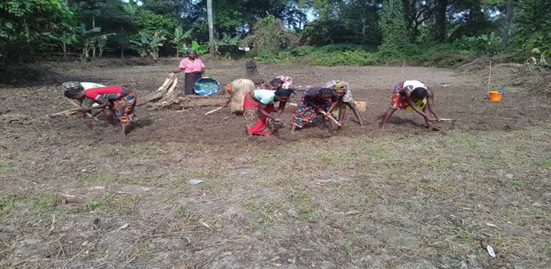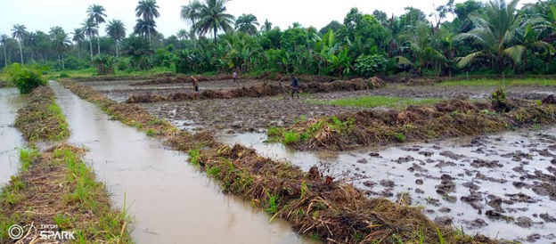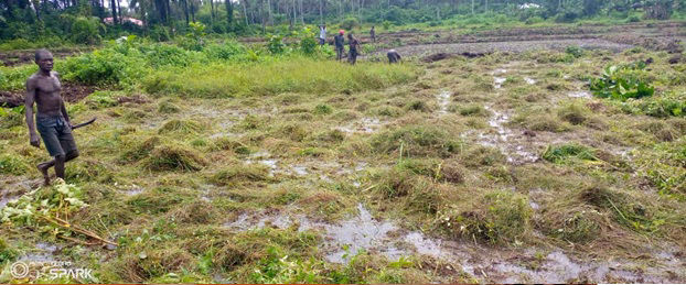 Traditional ponding activities exehibited by both male and female farmers at SAFS rice farming project in BAYAMA town in KPANGAKRIM chiefdom in PUJEHUN District.