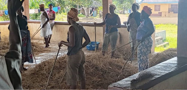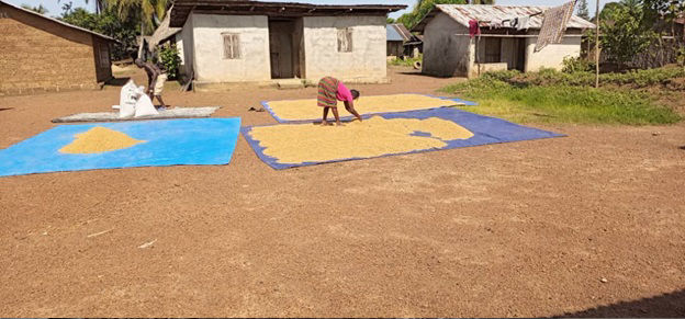 SAFS BAYAMA farmers on their Traditional rice drying methods. This is how the drying is been done here without a proper drying floor. The women have to spread tarpaulin or bags in other for the rice to dry up..